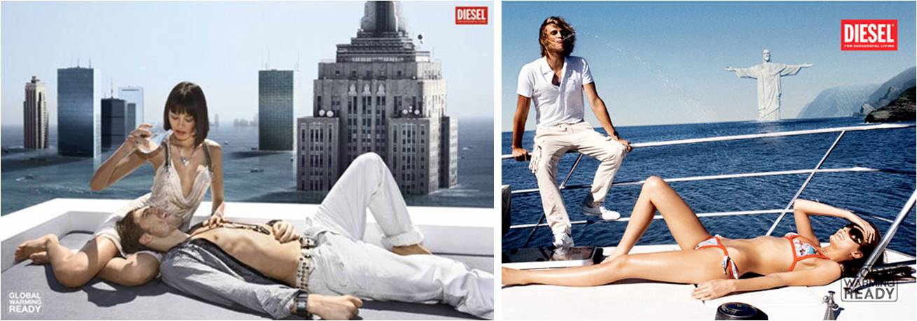 La utopía de la velocidad promovida por los diseñadores de los años 30 adquiere ahora total veracidad. En la sociedad del rápido consumo de imágenes, mantener la atención del hombre sobre su propia destrucción requiere de una fuerte estrategia comunicativa. Al no haber atravesado una verdadera guerra mundial en más de medio siglo, las imágenes del devenir distópico de la humanidad nos vienen dadas por conmovedores documentales o por campañas publicitarias que, demuestran como el tema ha sido tan ampliamente acogido, que puede ya alcanzar el punto de la ironía. Preparado para el calentamiento global reza el slogan de la campaña del 2007 de Diesel en compañía con el movimiento stopglobalwarming, tanto en su video para televisión como en sus fotografías podemos ver escenarios famosos a lo largo del mundo que sufren de los efectos del calentamiento: Nueva york oculto hasta la mitad por el aumento del nivel de los mares o Paris convertida en una selva; Ante el revuelo causado por algunas organizaciones medioambientales, la firma italiana ha comentado que “sólo son una compañía de moda y que no pensaban que por medio de un anuncio se pudiera salvar al mundo, pero si [su] poco convencional tono de voz y la reputación de la marca, así como captar la atención de la gente un poco más de lo que los telediarios pueden, [les] hace pensar dos veces en las consecuencias de todas sus acciones y darse cuenta de su responsabilidad individual, que algo tendrá que hacerse entonces”.
