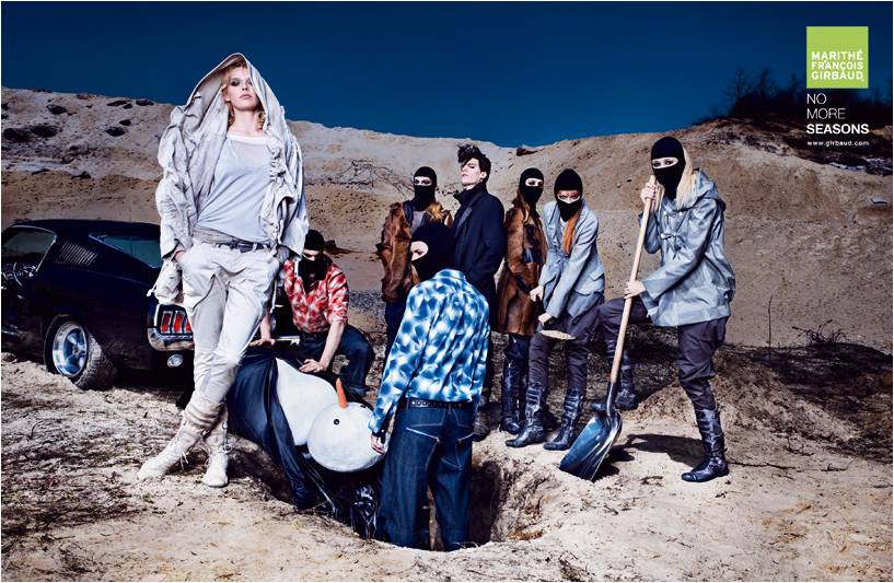 De igual manera el secuestro y la desaparición de un muñeco de nieve, símbolo del invierno en la campaña de Marithé Francois Girbaud “No more seasons” (no más estaciones), anuncia que la firma no seguirá más ese concepto de temporalidad en sus colecciones. Los consumidores optarán entonces por un comportamiento lógico: comprar prendas atemporales en época de crisis, que duren más allá de un concepto de primavera verano, otoño invierno. El carácter del slogan se conecta también con el cambio climático global, que tiene dislocadas las temperaturas en los países tradicionalmente regidos por las estaciones.